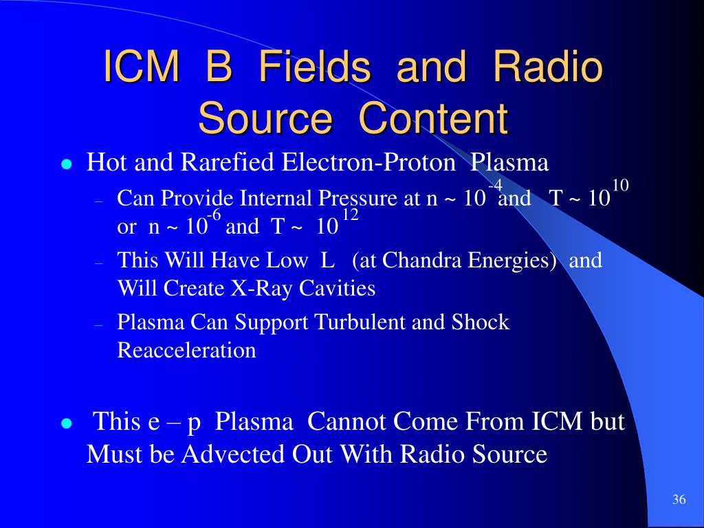 ICM B Fields and Radio Source Content • Hot and Rarefied Electron-Proton Plasma • Can Provide Internal Pressure at n ~ 10 and T ~ 10 or n ~ 10 and T ~ 10 • This Will Have Low L (at Chandra Energies) and Will Create X-Ray Cavities • Plasma Can Support Turbulent and Shock Reacceleration • This e – p Plasma Cannot Come From ICM but Must be Advected Out With Radio Source -4 10 -6 12