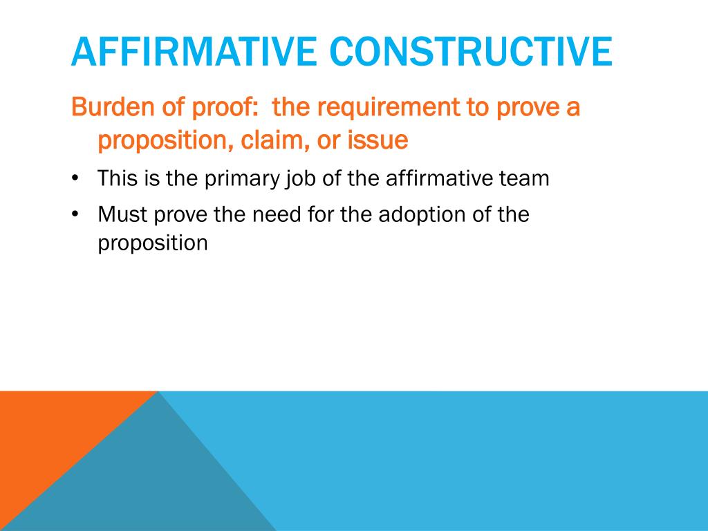 Affirmative constructive • Burden of proof: the requirement to prove a proposition, claim, or issue • This is the primary job of the affirmative team • Must prove the need for the adoption of the proposition