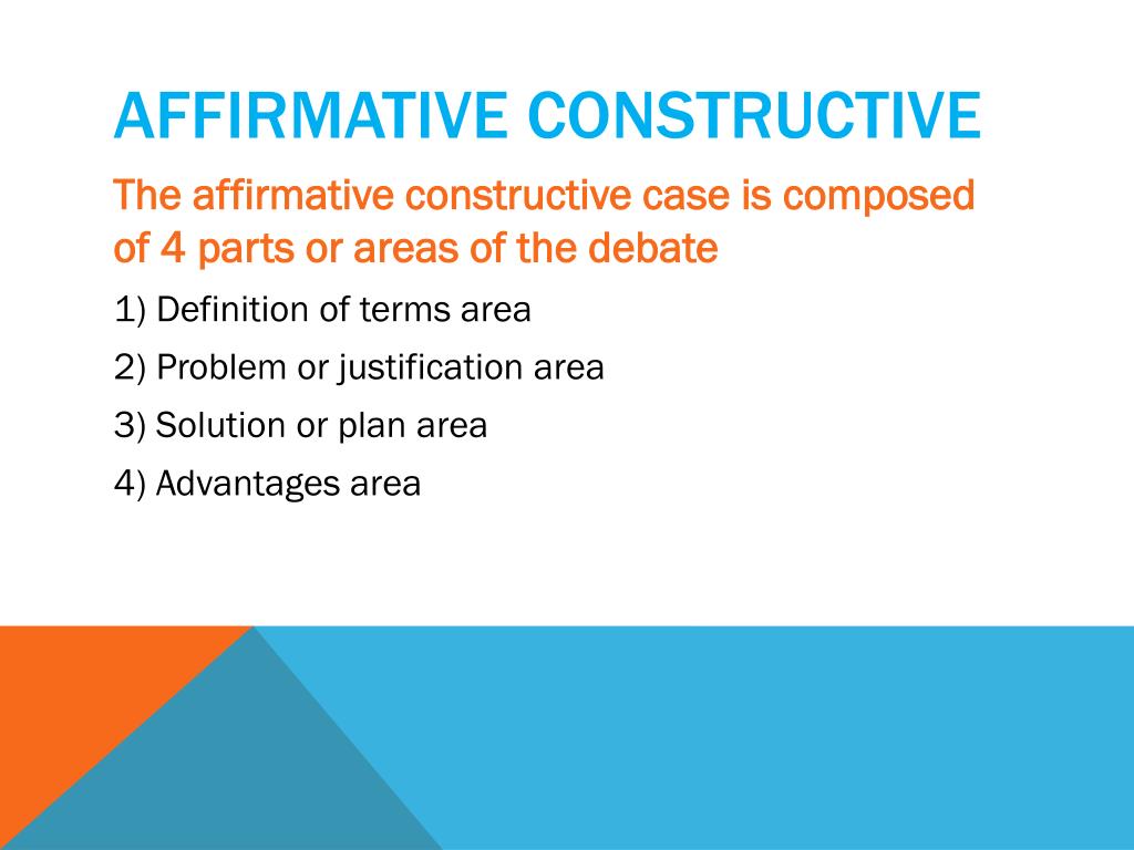 Affirmative Constructive • The affirmative constructive case is composed of 4 parts or areas of the debate • Definition of terms area • Problem or justification area • Solution or plan area • Advantages area