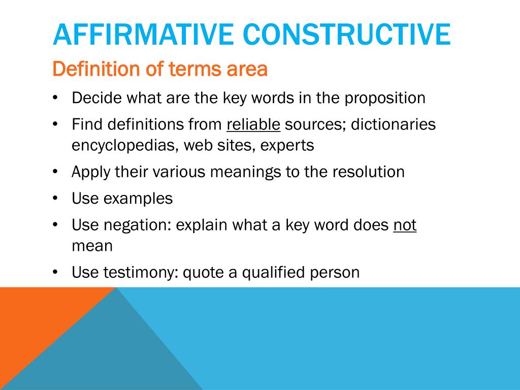 Affirmative Constructive • Definition of terms area • Decide what are the key words in the proposition • Find definitions from reliable sources; dictionaries encyclopedias, web sites, experts • Apply their various meanings to the resolution • Use examples • Use negation: explain what a key word does not mean • Use testimony: quote a qualified person