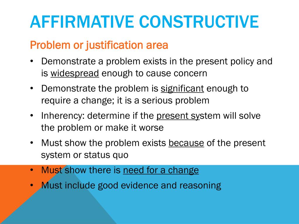 Affirmative Constructive • Problem or justification area • Demonstrate a problem exists in the present policy and is widespread enough to cause concern • Demonstrate the problem is significant enough to require a change; it is a serious problem • Inherency: determine if the present system will solve the problem or make it worse • Must show the problem exists because of the present system or status quo • Must show there is need for a change • Must include good evidence and reasoning