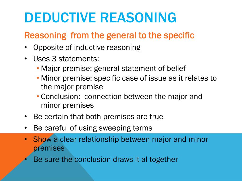 Deductive reasoning • Reasoning from the general to the specific • Opposite of inductive reasoning • Uses 3 statements: • Major premise: general statement of belief • Minor premise: specific case of issue as it relates to the major premise • Conclusion: connection between the major and minor premises • Be certain that both premises are true • Be careful of using sweeping terms • Show a clear relationship between major and minor premises • Be sure the conclusion draws it al together