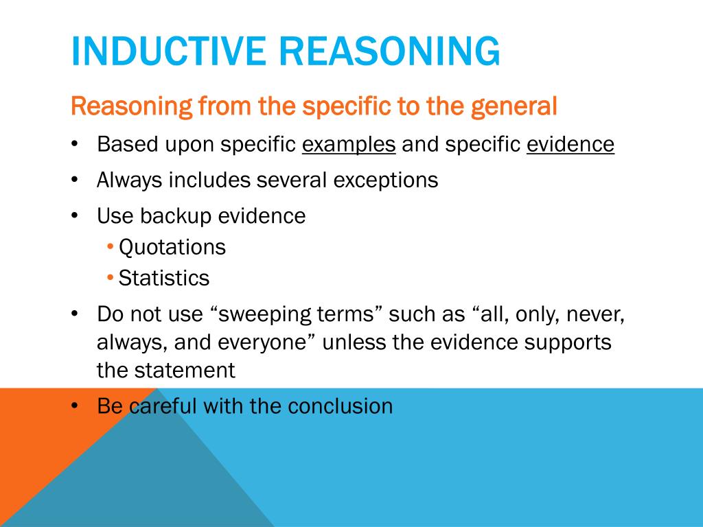 Inductive reasoning • Reasoning from the specific to the general • Based upon specific examples and specific evidence • Always includes several exceptions • Use backup evidence • Quotations • Statistics • Do not use “sweeping terms” such as “all, only, never, always, and everyone” unless the evidence supports the statement • Be careful with the conclusion