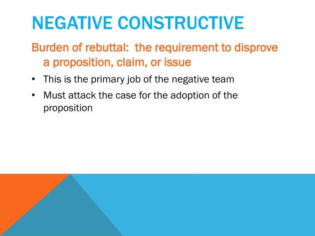 Negative constructive • Burden of rebuttal: the requirement to disprove a proposition, claim, or issue • This is the primary job of the negative team • Must attack the case for the adoption of the proposition