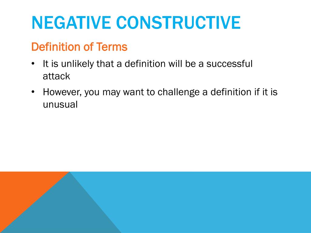 Negative constructive • Definition of Terms • It is unlikely that a definition will be a successful attack • However, you may want to challenge a definition if it is unusual