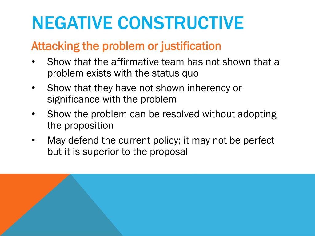 Negative constructive • Attacking the problem or justification • Show that the affirmative team has not shown that a problem exists with the status quo • Show that they have not shown inherency or significance with the problem • Show the problem can be resolved without adopting the proposition • May defend the current policy; it may not be perfect but it is superior to the proposal