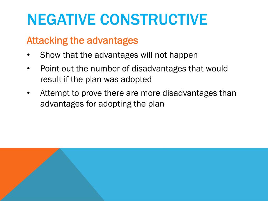 Negative constructive • Attacking the advantages • Show that the advantages will not happen • Point out the number of disadvantages that would result if the plan was adopted • Attempt to prove there are more disadvantages than advantages for adopting the plan