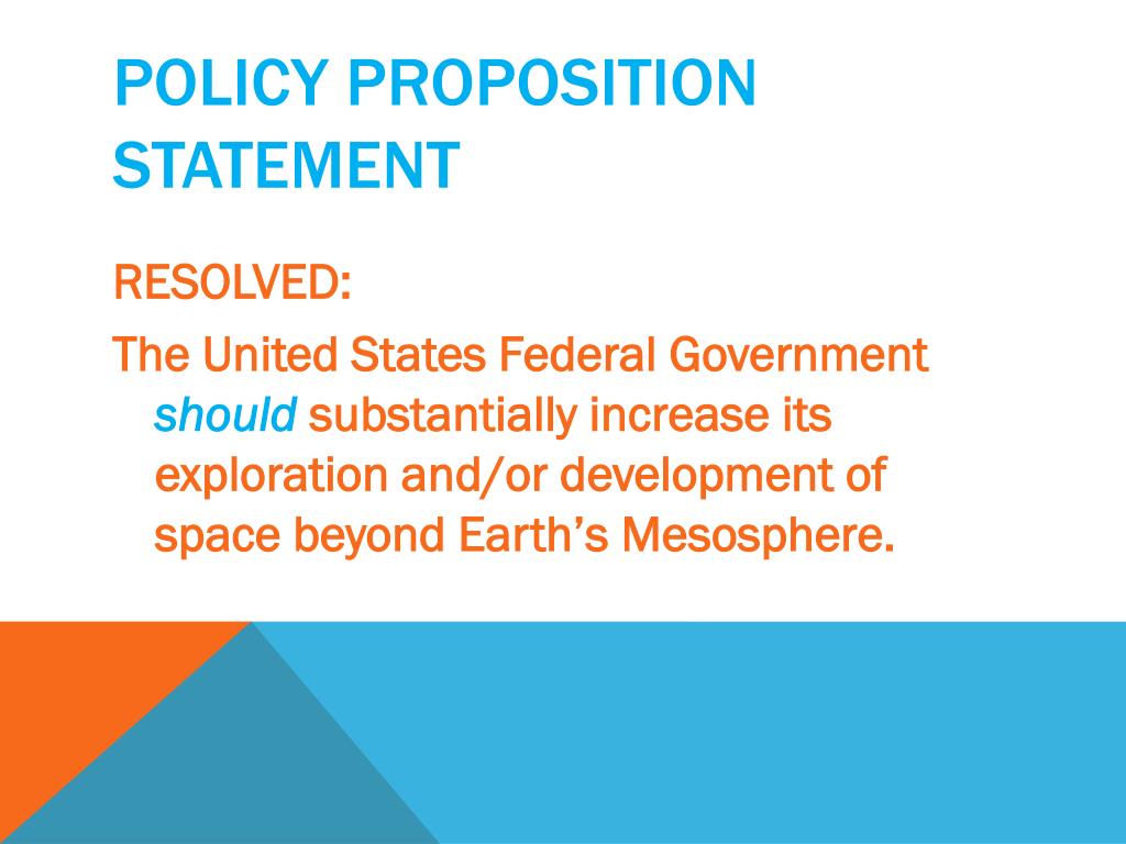 Policy proposition statement • RESOLVED: • The United States Federal Government should substantially increase its exploration and/or development of space beyond Earth’s Mesosphere.