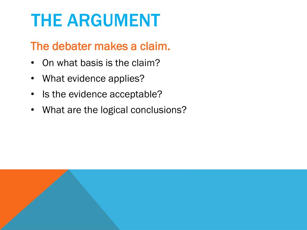 The argument • The debater makes a claim. • On what basis is the claim? • What evidence applies? • Is the evidence acceptable? • What are the logical conclusions?