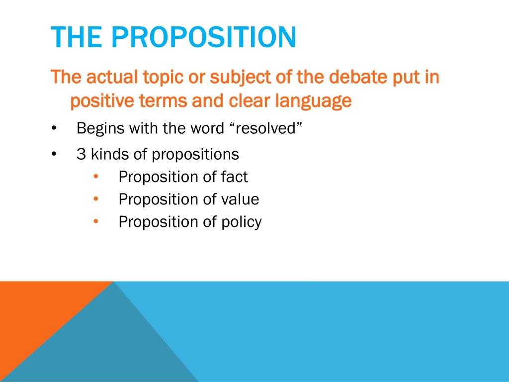 The proposition • The actual topic or subject of the debate put in positive terms and clear language • Begins with the word “resolved” • 3 kinds of propositions • Proposition of fact • Proposition of value • Proposition of policy