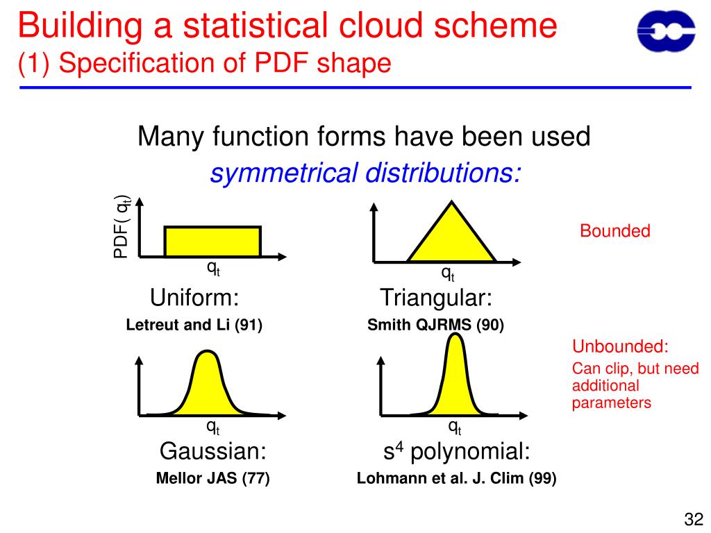 PDF( qt) qt qt Uniform: Letreut and Li (91) Triangular: Smith QJRMS (90) qt qt Gaussian: Mellor JAS (77) s4 polynomial: Lohmann et al. J. Clim (99) Building a statistical cloud scheme(1) Specification of PDF shape Many function forms have been used symmetrical distributions: Bounded Unbounded: Can clip, but need additional parameters