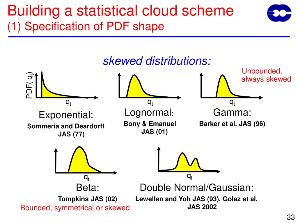 PDF( qt) qt qt qt Lognormal: Bony & Emanuel JAS (01) Gamma: Barker et al. JAS (96) Exponential: Sommeria and Deardorff JAS (77) qt qt Beta: Tompkins JAS (02) Building a statistical cloud scheme(1) Specification of PDF shape skewed distributions: Unbounded, always skewed Double Normal/Gaussian: Lewellen and Yoh JAS (93), Golaz et al. JAS 2002 Bounded, symmetrical or skewed