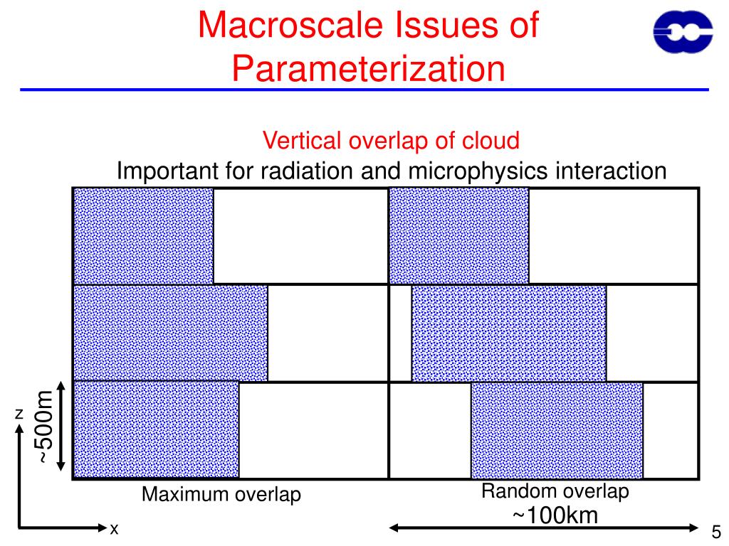 z x Macroscale Issues of Parameterization Vertical overlap of cloud Important for radiation and microphysics interaction ~500m Random overlap Maximum overlap ~100km