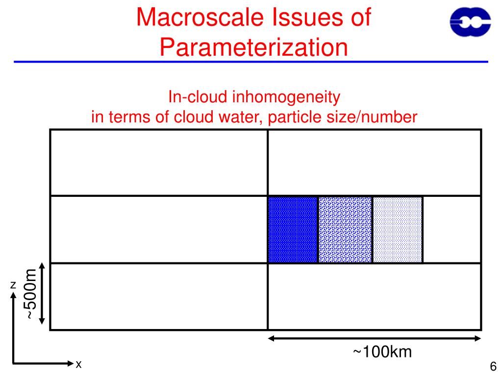 z x Macroscale Issues of Parameterization In-cloud inhomogeneity in terms of cloud water, particle size/number ~500m ~100km