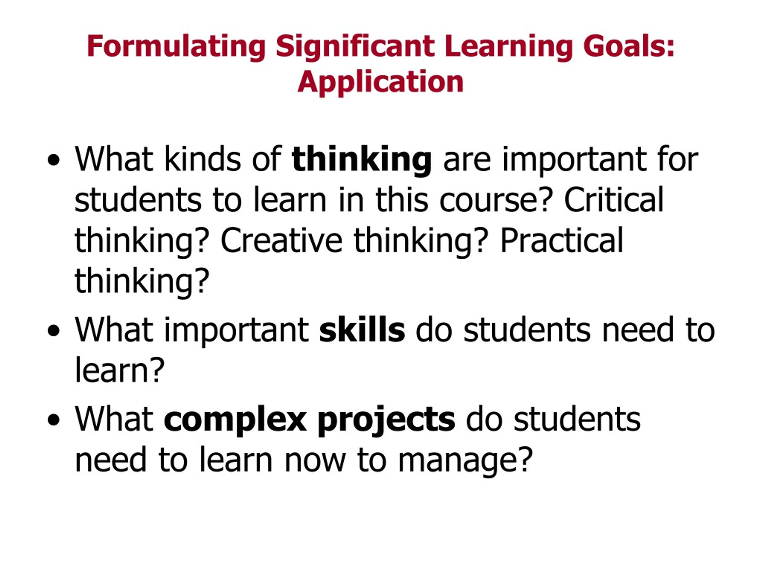 What kinds of thinking are important for students to learn in this course? Critical thinking? Creative thinking? Practical thinking? What important skills do students need to learn? What complex projects do students need to learn now to manage? Formulating Significant Learning Goals:Application