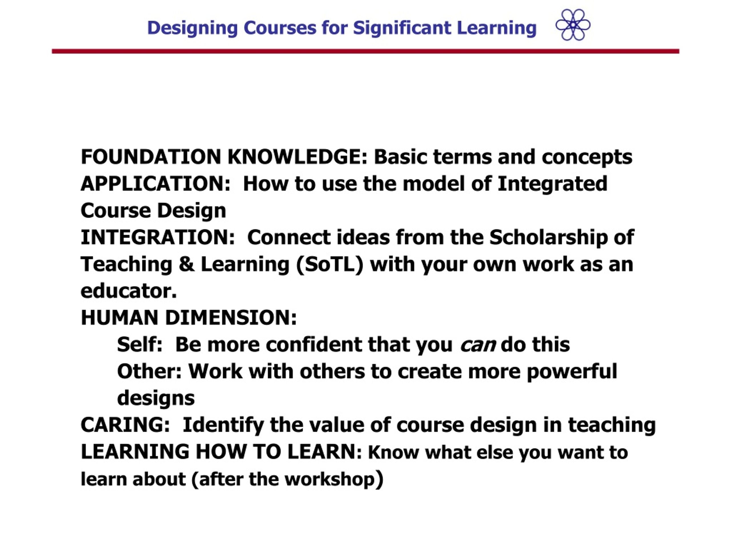 FOUNDATION KNOWLEDGE: Basic terms and concepts APPLICATION: How to use the model of Integrated Course Design • INTEGRATION: Connect ideas from the Scholarship of Teaching & Learning (SoTL) with your own work as an educator. • HUMAN DIMENSION: • Self: Be more confident that you can do this • Other: Work with others to create more powerful designs • CARING: Identify the value of course design in teaching • LEARNING HOW TO LEARN: Know what else you want to learn about (after the workshop)