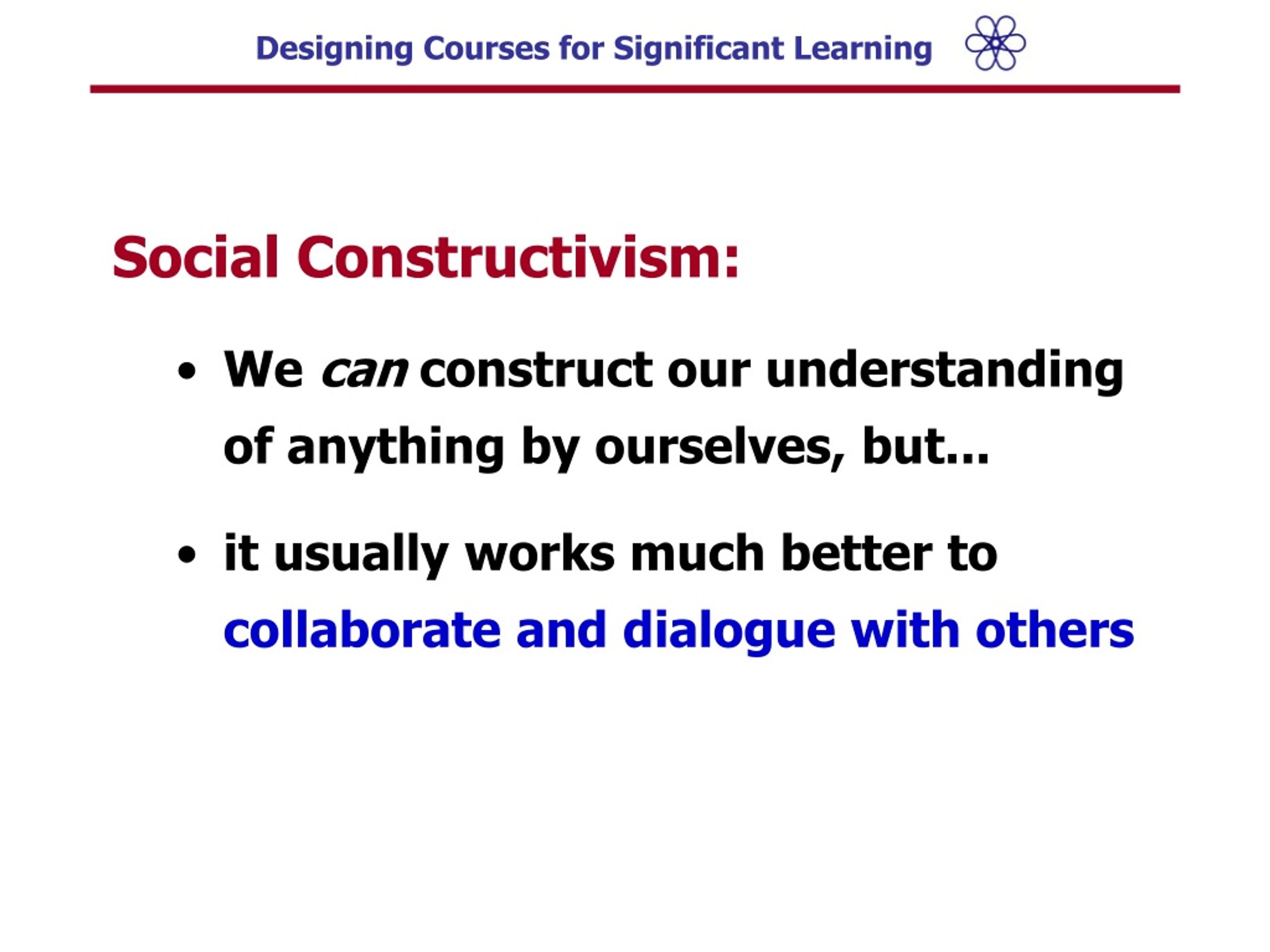 Social Constructivism: • We can construct our understanding of anything by ourselves, but... • it usually works much better to collaborate and dialogue with others