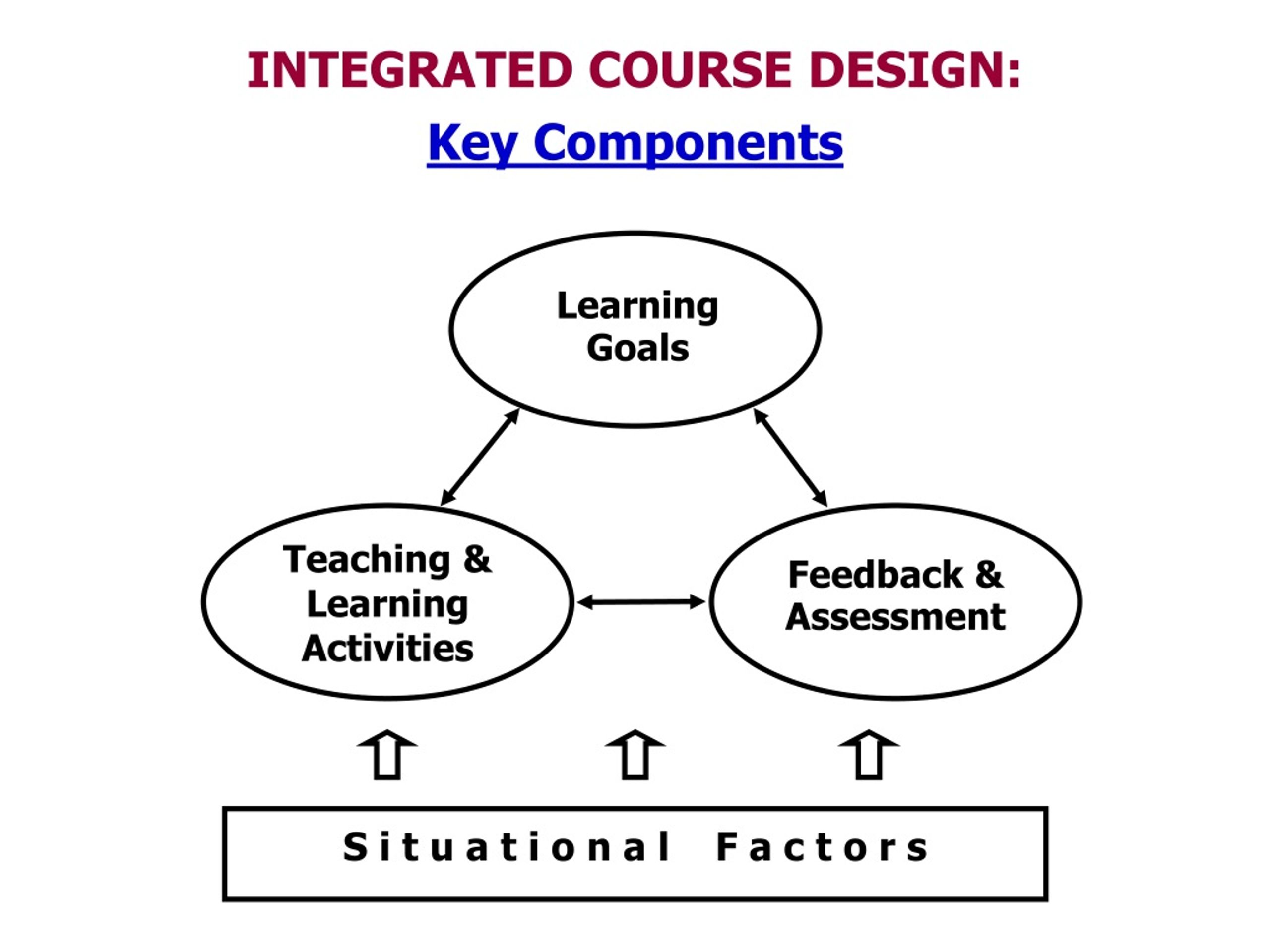 Teaching & Learning Activities Feedback & Assessment INTEGRATED COURSE DESIGN: Key Components Learning Goals S i t u a t i o n a l F a c t o r s