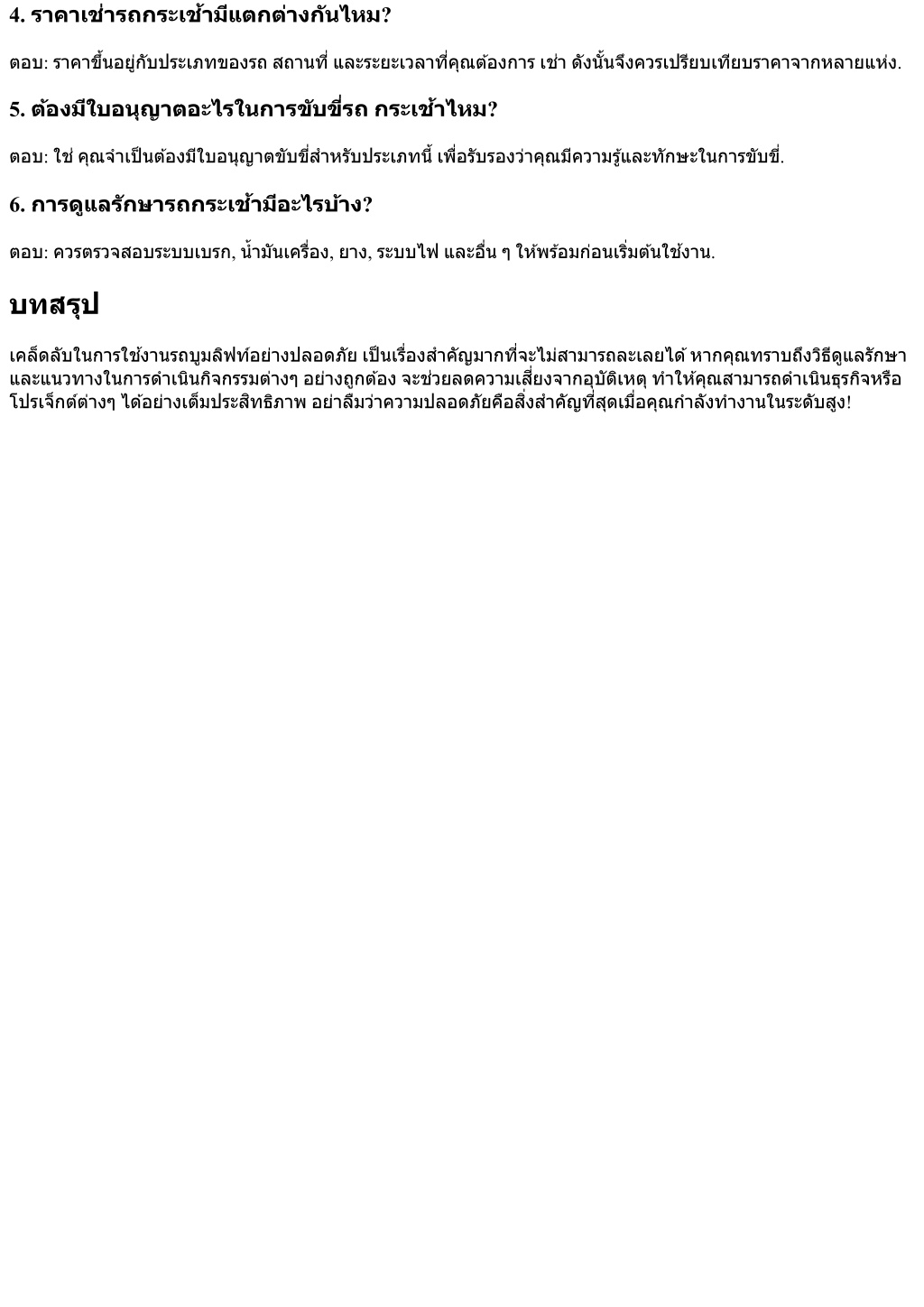 4. ราคาเช่ารถกระเช้ามีแตกต่างกันไหม? ตอบ: ราคาขึ?นอยู่กับประเภทของรถสถานที?และระยะเวลาที?คุณต้องการเช่าดังนั?นจึงควรเปรียบเทียบราคาจากหลายแห่ง. 5. ต้องมีใบอนุญาตอะไรในการขับขี?รถกระเช้าไหม? ตอบ: ใช่คุณจําเป็นต้องมีใบอนุญาตขับขี?สําหรับประเภทนี?เพื?อรับรองว่าคุณมีความรู้และทักษะในการขับขี?. 6. การดูแลรักษารถกระเช้ามีอะไรบ้าง? ตอบ: ควรตรวจสอบระบบเบรก, นํ?ามันเครื?อง, ยาง, ระบบไฟและอื?นๆให้พร้อมก่อนเริ?มต้นใช้งาน. บทสรุป เคล็ดลับในการใช้งานรถบูมลิฟท์อย่างปลอดภัยเป็นเรื?องสําคัญมากที?จะไม่สามารถละเลยได้หากคุณทราบถึงวิธีดูแลรักษา และแนวทางในการดําเนินกิจกรรมต่างๆอย่างถูกต้องจะช่วยลดความเสี?ยงจากอุบัติเหตุทําให้คุณสามารถดําเนินธุรกิจหรือ โปรเจ็กต์ต่างๆได้อย่างเต็มประสิทธิภาพอย่าลืมว่าความปลอดภัยคือสิ?งสําคัญที?สุดเมื?อคุณกําลังทํางานในระดับสูง!