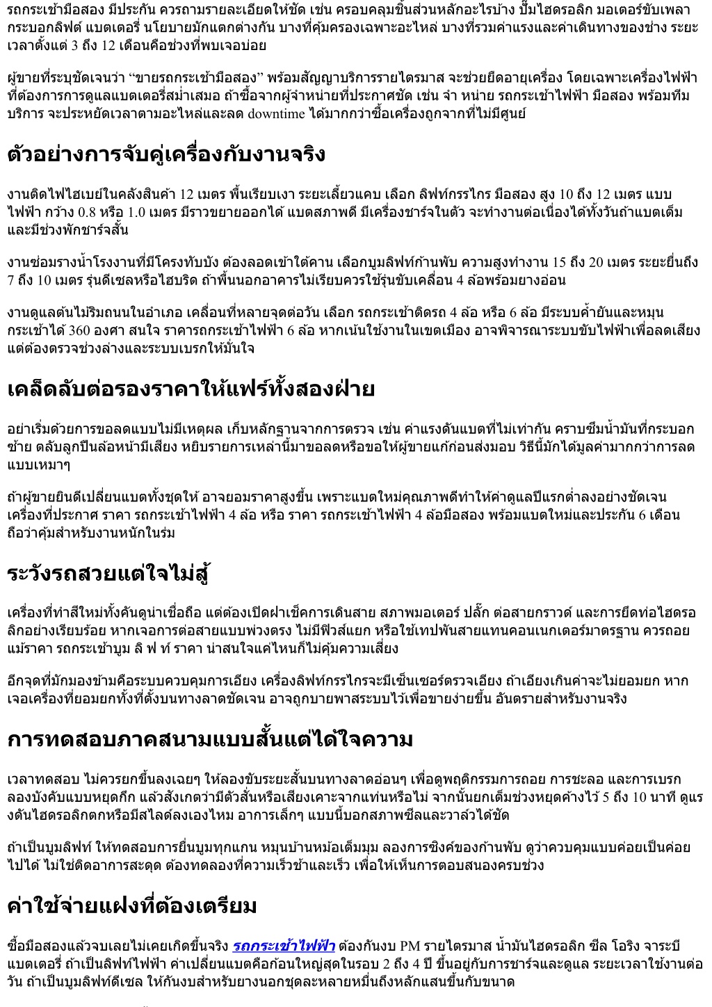 รถกระเช้ามือสองมีประกันควรถามรายละเอียดให้ชัดเช่นครอบคลุมชิ?นส่วนหลักอะไรบ้างปั?มไฮดรอลิกมอเตอร์ขับเพลารถกระเช้ามือสองมีประกันควรถามรายละเอียดให้ชัดเช่นครอบคลุมชิ?นส่วนหลักอะไรบ้างปั?มไฮดรอลิกมอเตอร์ขับเพลา กระบอกลิฟต์แบตเตอรี?นโยบายมักแตกต่างกันบางที?คุ้มครองเฉพาะอะไหล่บางที?รวมค่าแรงและค่าเดินทางของช่างระยะ เวลาตั?งแต่ 3 ถึง 12 เดือนคือช่วงที?พบเจอบ่อย ผู้ขายที?ระบุชัดเจนว่า “ขายรถกระเช้ามือสอง” พร้อมสัญญาบริการรายไตรมาสจะช่วยยืดอายุเครื?องโดยเฉพาะเครื?องไฟฟ้า ที?ต้องการการดูแลแบตเตอรี?สมํ?าเสมอถ้าซื?อจากผู้จําหน่ายที?ประกาศชัดเช่นจําหน่ายรถกระเช้าไฟฟ้ามือสองพร้อมทีม บริการจะประหยัดเวลาตามอะไหล่และลด downtime ได้มากกว่าซื?อเครื?องถูกจากที?ไม่มีศูนย์ ตัวอย่างการจับคู่เครื?องกับงานจริง งานติดไฟไฮเบย์ในคลังสินค้า 12 เมตรพื?นเรียบเงาระยะเลี?ยวแคบเลือกลิฟท์กรรไกรมือสองสูง 10 ถึง 12 เมตรแบบ ไฟฟ้ากว้าง 0.8 หรือ 1.0 เมตรมีราวขยายออกได้แบตสภาพดีมีเครื?องชาร์จในตัวจะทํางานต่อเนื?องได้ทั?งวันถ้าแบตเต็ม และมีช่วงพักชาร์จสั?น งานซ่อมรางนํ?าโรงงานที?มีโครงทับบังต้องลอดเข้าใต้คานเลือกบูมลิฟท์ก้านพับความสูงทํางาน 15 ถึง 20 เมตรระยะยื?นถึง 7 ถึง 10 เมตรรุ่นดีเซลหรือไฮบริดถ้าพื?นนอกอาคารไม่เรียบควรใช้รุ่นขับเคลื?อน 4 ล้อพร้อมยางอ่อน งานดูแลต้นไม้ริมถนนในอําเภอเคลื?อนที?หลายจุดต่อวันเลือกรถกระเช้าติดรถ 4 ล้อหรือ 6 ล้อมีระบบคํ?ายันและหมุน กระเช้าได้ 360 องศาสนใจราคารถกระเช้าไฟฟ้า 6 ล้อหากเน้นใช้งานในเขตเมืองอาจพิจารณาระบบขับไฟฟ้าเพื?อลดเสียง แต่ต้องตรวจช่วงล่างและระบบเบรกให้มั?นใจ เคล็ดลับต่อรองราคาให้แฟร์ทั?งสองฝ ่ าย อย่าเริ?มด้วยการขอลดแบบไม่มีเหตุผลเก็บหลักฐานจากการตรวจเช่นค่าแรงดันแบตที?ไม่เท่ากันคราบซึมนํ?ามันที?กระบอก ซ้ายตลับลูกปืนล้อหน้ามีเสียงหยิบรายการเหล่านี?มาขอลดหรือขอให้ผู้ขายแก้ก่อนส่งมอบวิธีนี?มักได้มูลค่ามากกว่าการลด แบบเหมาๆ ถ้าผู้ขายยินดีเปลี?ยนแบตทั?งชุดให้อาจยอมราคาสูงขึ?นเพราะแบตใหม่คุณภาพดีทําให้ค่าดูแลปีแรกตํ?าลงอย่างชัดเจน เครื?องที?ประกาศราคารถกระเช้าไฟฟ้า 4 ล้อหรือราคารถกระเช้าไฟฟ้า 4 ล้อมือสองพร้อมแบตใหม่และประกัน 6 เดือน ถือว่าคุ้มสําหรับงานหนักในร่ม ระวังรถสวยแต่ใจไม่สู้ เครื?องที?ทําสีใหม่ทั?งคันดูน่าเชื?อถือแต่ต้องเปิดฝาเช็คการเดินสายสภาพมอเตอร์ปลั?กต่อสายกราวด์และการยึดท่อไฮดรอ ลิกอย่างเรียบร้อยหากเจอการต่อสายแบบพ่วงตรงไม่มีฟิวส์แยกหรือใช้เทปพันสายแทนคอนเน