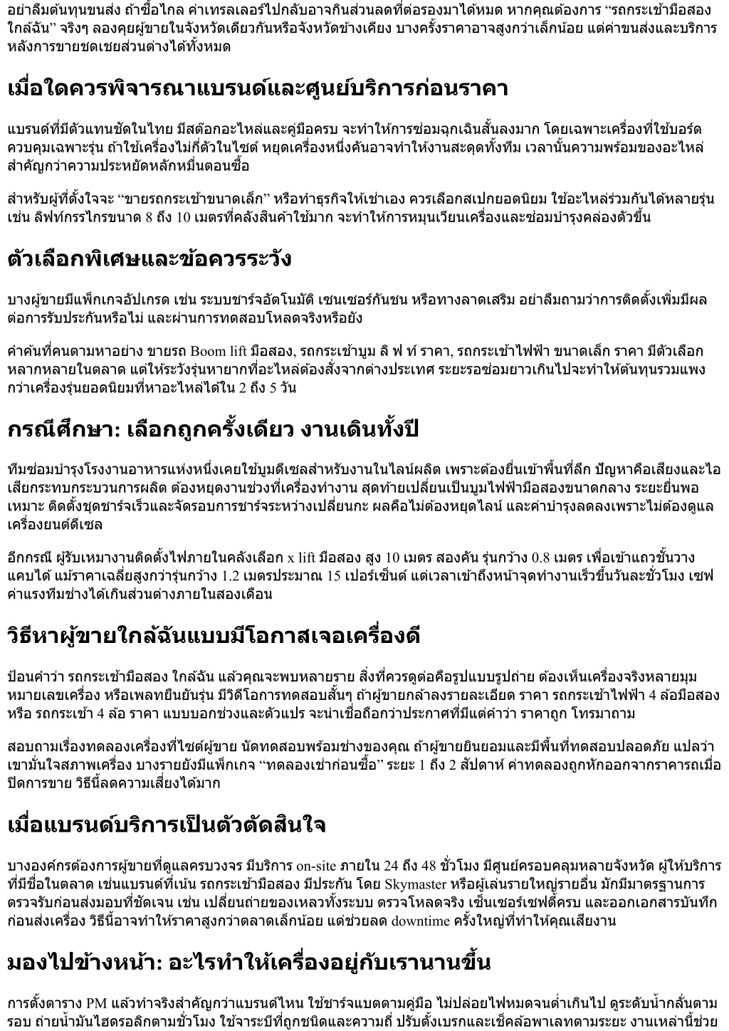 อย่าลืมต้นทุนขนส่งถ้าซื?อไกลค่าเทรลเลอร์ไปกลับอาจกินส่วนลดที?ต่อรองมาได้หมดหากคุณต้องการ “รถกระเช้ามือสอง ใกล้ฉัน” จริงๆลองคุยผู้ขายในจังหวัดเดียวกันหรือจังหวัดข้างเคียงบางครั?งราคาอาจสูงกว่าเล็กน้อยแต่ค่าขนส่งและบริการ หลังการขายชดเชยส่วนต่างได้ทั?งหมด เมื?อใดควรพิจารณาแบรนด์และศูนย์บริการก่อนราคา แบรนด์ที?มีตัวแทนชัดในไทยมีสต๊อกอะไหล่และคู่มือครบจะทําให้การซ่อมฉุกเฉินสั?นลงมากโดยเฉพาะเครื?องที?ใช้บอร์ด ควบคุมเฉพาะรุ่นถ้าใช้เครื?องไม่กี?ตัวในไซต์หยุดเครื?องหนึ?งคันอาจทําให้งานสะดุดทั?งทีมเวลานั?นความพร้อมของอะไหล่ สําคัญกว่าความประหยัดหลักหมื?นตอนซื?อ สําหรับผู้ที?ตั?งใจจะ “ขายรถกระเช้าขนาดเล็ก” หรือทําธุรกิจให้เช่าเองควรเลือกสเปกยอดนิยมใช้อะไหล่ร่วมกันได้หลายรุ่น เช่นลิฟท์กรรไกรขนาด 8 ถึง 10 เมตรที?คลังสินค้าใช้มากจะทําให้การหมุนเวียนเครื?องและซ่อมบํารุงคล่องตัวขึ?น ตัวเลือกพิเศษและข้อควรระวัง บางผู้ขายมีแพ็กเกจอัปเกรดเช่นระบบชาร์จอัตโนมัติเซนเซอร์กันชนหรือทางลาดเสริมอย่าลืมถามว่าการติดตั?งเพิ?มมีผล ต่อการรับประกันหรือไม่และผ่านการทดสอบโหลดจริงหรือยัง คําค้นที?คนตามหาอย่างขายรถ Boom lift มือสอง, รถกระเช้าบูมลิฟท์ราคา, รถกระเช้าไฟฟ้าขนาดเล็กราคามีตัวเลือก หลากหลายในตลาดแต่ให้ระวังรุ่นหายากที?อะไหล่ต้องสั?งจากต่างประเทศระยะรอซ่อมยาวเกินไปจะทําให้ต้นทุนรวมแพง กว่าเครื?องรุ่นยอดนิยมที?หาอะไหล่ได้ใน 2 ถึง 5 วัน กรณีศึกษา: เลือกถูกครั?งเดียวงานเดินทั?งปี ทีมซ่อมบํารุงโรงงานอาหารแห่งหนึ?งเคยใช้บูมดีเซลสําหรับงานในไลน์ผลิตเพราะต้องยื?นเข้าพื?นที?ลึกปัญหาคือเสียงและไอ เสียกระทบกระบวนการผลิตต้องหยุดงานช่วงที?เครื?องทํางานสุดท้ายเปลี?ยนเป็นบูมไฟฟ้ามือสองขนาดกลางระยะยื?นพอ เหมาะติดตั?งชุดชาร์จเร็วและจัดรอบการชาร์จระหว่างเปลี?ยนกะผลคือไม่ต้องหยุดไลน์และค่าบํารุงลดลงเพราะไม่ต้องดูแล เครื?องยนต์ดีเซล อีกกรณีผู้รับเหมางานติดตั?งไฟภายในคลังเลือก x lift มือสองสูง 10 เมตรสองคันรุ่นกว้าง 0.8 เมตรเพื?อเข้าแถวชั?นวาง แคบได้แม้ราคาเฉลี?ยสูงกว่ารุ่นกว้าง 1.2 เมตรประมาณ 15 เปอร์เซ็นต์แต่เวลาเข้าถึงหน้าจุดทํางานเร็วขึ?นวันละชั?วโมงเซฟ ค่าแรงทีมช่างได้เกินส่วนต่างภายในสองเดือน วิธีหาผู้ขายใกล้ฉันแบบมีโอกาสเจอเครื?องดี ป้อนคําว่ารถกระเช้ามือสองใกล้ฉันแล้วคุณจะพบหลายรายสิ?งที?ควรดูต่อคือรูปแบบรูปถ่ายต้องเห็นเครื?องจริงหลายมุม หมายเลขเครื?องหรือเพลทยืนยันรุ่นมีวิดีโอการทดสอบสั?นๆถ้าผ