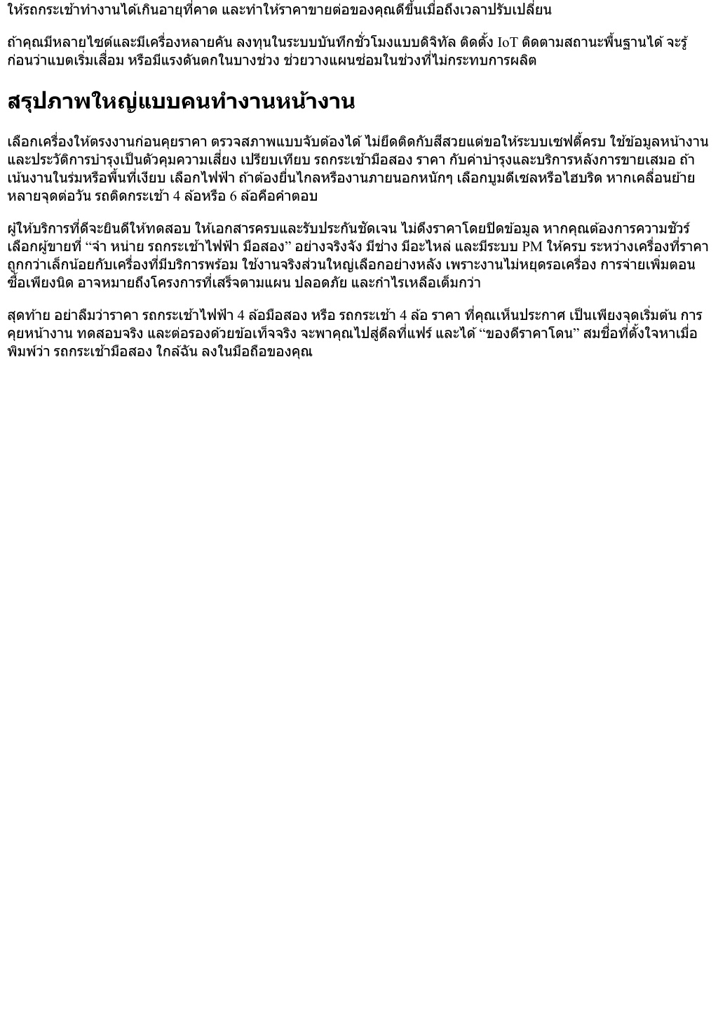 ให้รถกระเช้าทํางานได้เกินอายุที?คาดและทําให้ราคาขายต่อของคุณดีขึ?นเมื?อถึงเวลาปรับเปลี?ยนให้รถกระเช้าทํางานได้เกินอายุที?คาดและทําให้ราคาขายต่อของคุณดีขึ?นเมื?อถึงเวลาปรับเปลี?ยน ถ้าคุณมีหลายไซต์และมีเครื?องหลายคันลงทุนในระบบบันทึกชั?วโมงแบบดิจิทัลติดตั?ง IoT ติดตามสถานะพื?นฐานได้จะรู้ ก่อนว่าแบตเริ?มเสื?อมหรือมีแรงดันตกในบางช่วงช่วยวางแผนซ่อมในช่วงที?ไม่กระทบการผลิต สรุปภาพใหญ่แบบคนทํางานหน้างาน เลือกเครื?องให้ตรงงานก่อนคุยราคาตรวจสภาพแบบจับต้องได้ไม่ยึดติดกับสีสวยแต่ขอให้ระบบเซฟตี?ครบใช้ข้อมูลหน้างาน และประวัติการบํารุงเป็นตัวคุมความเสี?ยงเปรียบเทียบรถกระเช้ามือสองราคากับค่าบํารุงและบริการหลังการขายเสมอถ้า เน้นงานในร่มหรือพื?นที?เงียบเลือกไฟฟ้าถ้าต้องยื?นไกลหรืองานภายนอกหนักๆเลือกบูมดีเซลหรือไฮบริดหากเคลื?อนย้าย หลายจุดต่อวันรถติดกระเช้า 4 ล้อหรือ 6 ล้อคือคําตอบ ผู้ให้บริการที?ดีจะยินดีให้ทดสอบให้เอกสารครบและรับประกันชัดเจนไม่ดึงราคาโดยปิดข้อมูลหากคุณต้องการความชัวร์ เลือกผู้ขายที? “จําหน่ายรถกระเช้าไฟฟ้ามือสอง” อย่างจริงจังมีช่างมีอะไหล่และมีระบบ PM ให้ครบระหว่างเครื?องที?ราคา ถูกกว่าเล็กน้อยกับเครื?องที?มีบริการพร้อมใช้งานจริงส่วนใหญ่เลือกอย่างหลังเพราะงานไม่หยุดรอเครื?องการจ่ายเพิ?มตอน ซื?อเพียงนิดอาจหมายถึงโครงการที?เสร็จตามแผนปลอดภัยและกําไรเหลือเต็มกว่า สุดท้ายอย่าลืมว่าราคารถกระเช้าไฟฟ้า 4 ล้อมือสองหรือรถกระเช้า 4 ล้อราคาที?คุณเห็นประกาศเป็นเพียงจุดเริ?มต้นการ คุยหน้างานทดสอบจริงและต่อรองด้วยข้อเท็จจริงจะพาคุณไปสู่ดีลที?แฟร์และได้ “ของดีราคาโดน” สมชื?อที?ตั?งใจหาเมื?อ พิมพ์ว่ารถกระเช้ามือสองใกล้ฉันลงในมือถือของคุณ