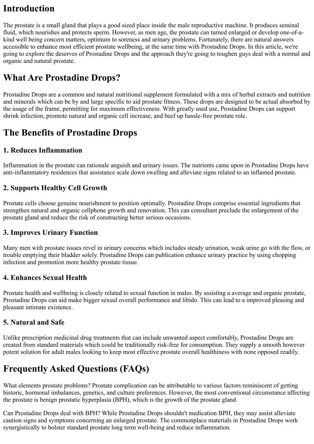 Introduction The prostate is a small gland that plays a good sized place inside the male reproductive machine. It produces seminal fluid, which nourishes and protects sperm. However, as men age, the prostate can turned enlarged or develop one-of-a- kind well being concern matters, optimum to soreness and urinary problems. Fortunately, there are natural answers accessible to enhance most efficient prostate wellbeing, at the same time with Prostadine Drops. In this article, we're going to explore the deserves of Prostadine Drops and the approach they're going to toughen guys deal with a normal and organic and natural prostate. What Are Prostadine Drops? Prostadine Drops are a common and natural nutritional supplement formulated with a mix of herbal extracts and nutrition and minerals which can be by and large specific to aid prostate fitness. These drops are designed to be actual absorbed by the usage of the frame, permitting for maximum effectiveness. With greatly used use, Prostadine Drops can support shrink infection, promote natural and organic cell increase, and beef up hassle-free prostate role. The Benefits of Prostadine Drops 1. Reduces Inflammation Inflammation in the prostate can rationale anguish and urinary issues. The nutrients came upon in Prostadine Drops have anti-inflammatory residences that assistance scale down swelling and alleviate signs related to an inflamed prostate. 2. Supports Healthy Cell Growth Prostate cells choose genuine nourishment to position optimally. Prostadine Drops comprise essential ingredients that strengthen natural and organic cellphone growth and renovation. This can consultant preclude the enlargement of the prostate gland and reduce the risk of constructing better serious occasions. 3. Improves Urinary Function Many men with prostate issues revel in urinary concerns which includes steady urination, weak urine go with the flow, or trouble emptying their bladder solely. Prostadine Drops can publication enhance urinary practice by using chopping infection and promotion more healthy prostate tissue. 4. Enhances Sexual Health Prostate health and wellbeing is closely related to sexual function in males. By assisting a average and organic prostate, Prostadine Drops can aid make bigger sexual overall performance and libido. This can lead to a improved pleasing and pleasant intimate existence. 5. Natural and Safe Unlike prescription medicinal drug treatments that can include unwanted aspect comfortably, Prostadine Drops are created from standard materials which could be traditionally risk-free for consumption. They supply a smooth however potent solution for adult males looking to keep most effective prostate overall healthiness with none opposed readily. Frequently Asked Questions (FAQs) What elements prostate problems? Prostate complication can be attributable to various factors reminiscent of getting historic, hormonal imbalances, genetics, and culture preferences. However, the most conventional circumstance affecting the prostate is benign prostatic hyperplasia (BPH), which is the growth of the prostate gland. Can Prostadine Drops deal with BPH? While Prostadine Drops shouldn't medication BPH, they may assist alleviate caution signs and symptoms concerning an enlarged prostate. The commonplace materials in Prostadine Drops work synergistically to bolster standard prostate long term well-being and reduce inflammation.