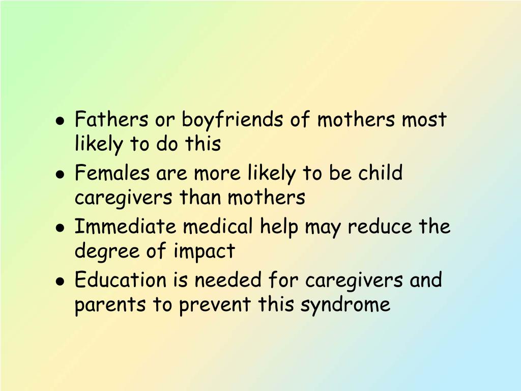 Fathers or boyfriends of mothers most likely to do this Females are more likely to be child caregivers than mothers Immediate medical help may reduce the degree of impact Education is needed for caregivers and parents to prevent this syndrome