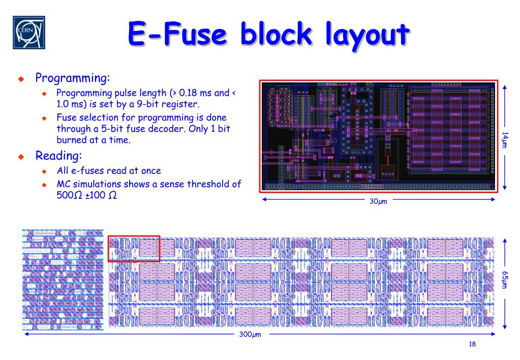 E-Fuses • IBM stop providing the laser blown fuses: “The “laser fuses” cost more, occupy more area than the e-FUSE, function at the wafer level only, and prohibit placement of circuits below and wiring above the fuse”. • E-fuses are made by electronically “burning” a salicidedpolysilicon strip. Before and after burning the resistance is changed from ~100 Ω to >5KΩ • This means: • Wafers from IBM will come “blank” • Higher system complexity : logic to burn and logic to read • Burning needs 3.3V power supply • Programming transistor current Ion 10 mA < Ion < 13.5mA • Programming time: > 0.18 ms and < 1.0 ms • 32-bit included and burned during probe testing