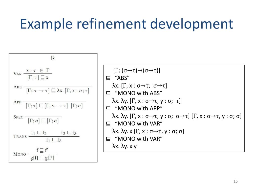 Example refinement development [Γ; (σ→τ)→(σ→τ)] ⊑ “ABS” λx. [Γ, x : σ→τ; σ→τ] ⊑ “MONO with ABS” λx. λy. [Γ, x : σ→τ, y : σ; τ] ⊑ “MONO with APP” λx. λy. [Γ, x : σ→τ, y : σ; σ→τ] [Γ, x : σ→τ, y : σ; σ] ⊑ “MONO with VAR” λx. λy. x [Γ, x : σ→τ, y : σ; σ] ⊑ “MONO with VAR” λx. λy. x y