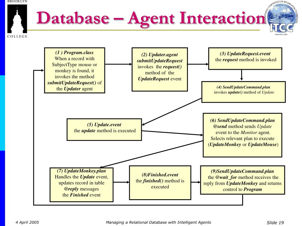 Database – Agent Interaction (1 ) Program.class When a record with SubjectType mouse or monkey is found, it invokes the method submitUpdateRequest() of the Updater agent (2) Updater.agent submitUpdateRequestinvokes therequest() method of the UpdateRequest event (3) UpdateRequest.event therequest method isinvoked (4) SendUpdateCommand.plan invokes update() method of Update (6) SendUpdateCommand.plan @send method sends Update event to the Monitor agent. Selects relevant plan to execute (UpdateMonkey or UpdateMouse) (5) Update.event the update method is executed (8)Finished.event the finished() method is executed (9)SendUpdateCommand.plan the @wait_for method receives the reply from UpdateMonkey and returns control to Program (7) UpdateMonkey.plan Handles theUpdate event, updates record in table @reply messages the Finished event Managing a Relational Database with Intelligent Agents