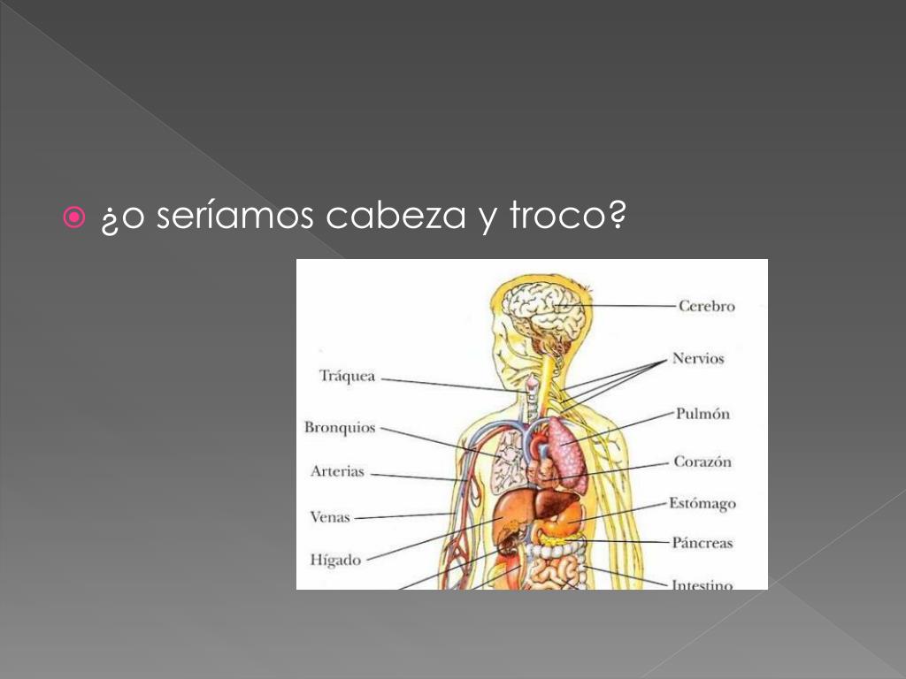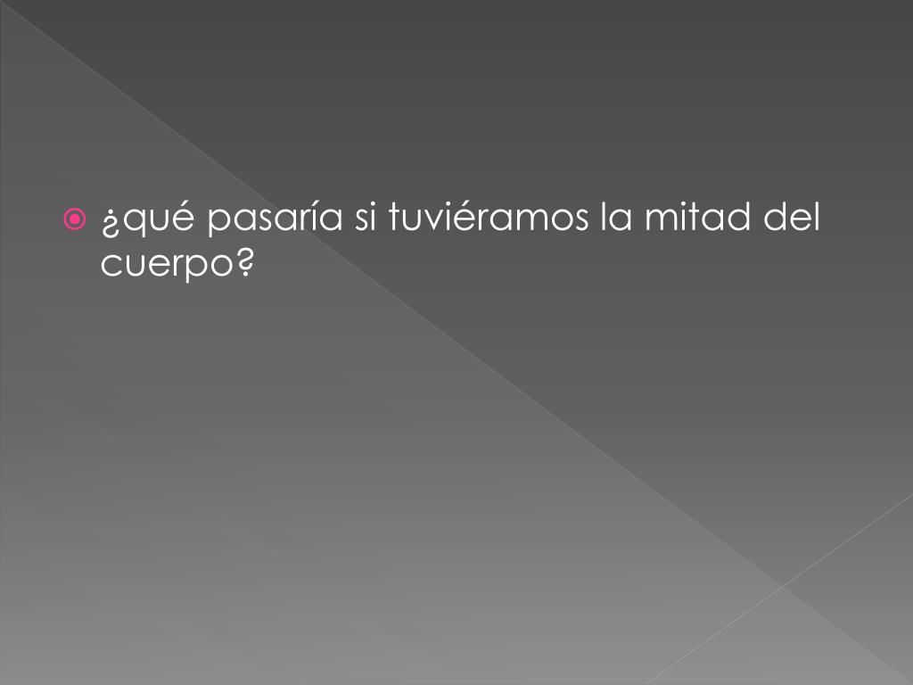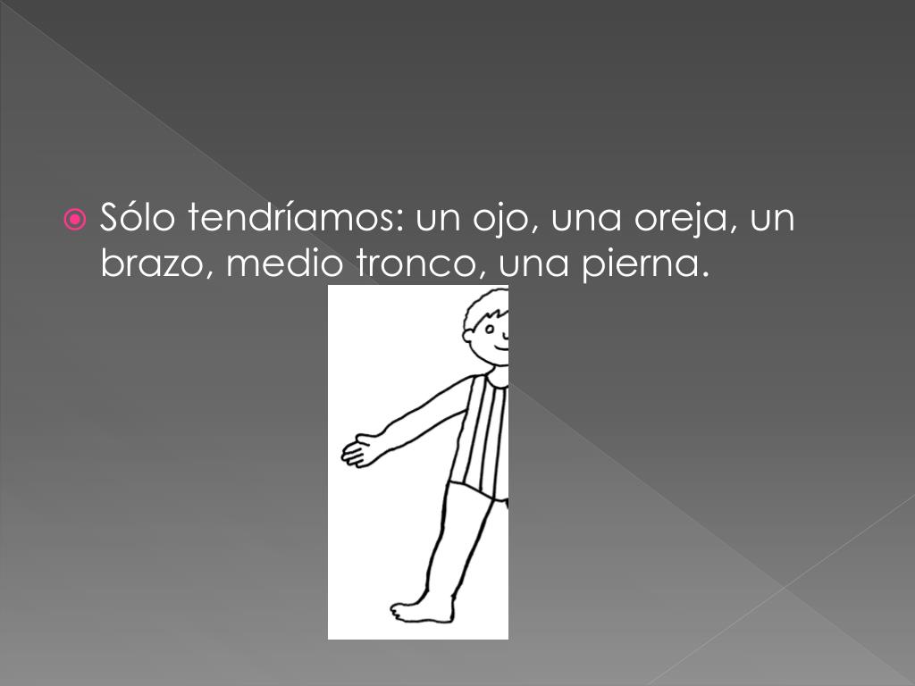 La mitad de mi cuerpo. ¿qué pasaría si tuviéramos la mitad del cuerpo?. Sólo tendríamos: un ojo, una oreja, un brazo, medio tronco, una pierna. En lugar de tener 20 dedos, tendríamos sólo 10, 5 en una mano y 5 en un pie. En lugar de tener 24 costillas, tendíamos sólo 12.