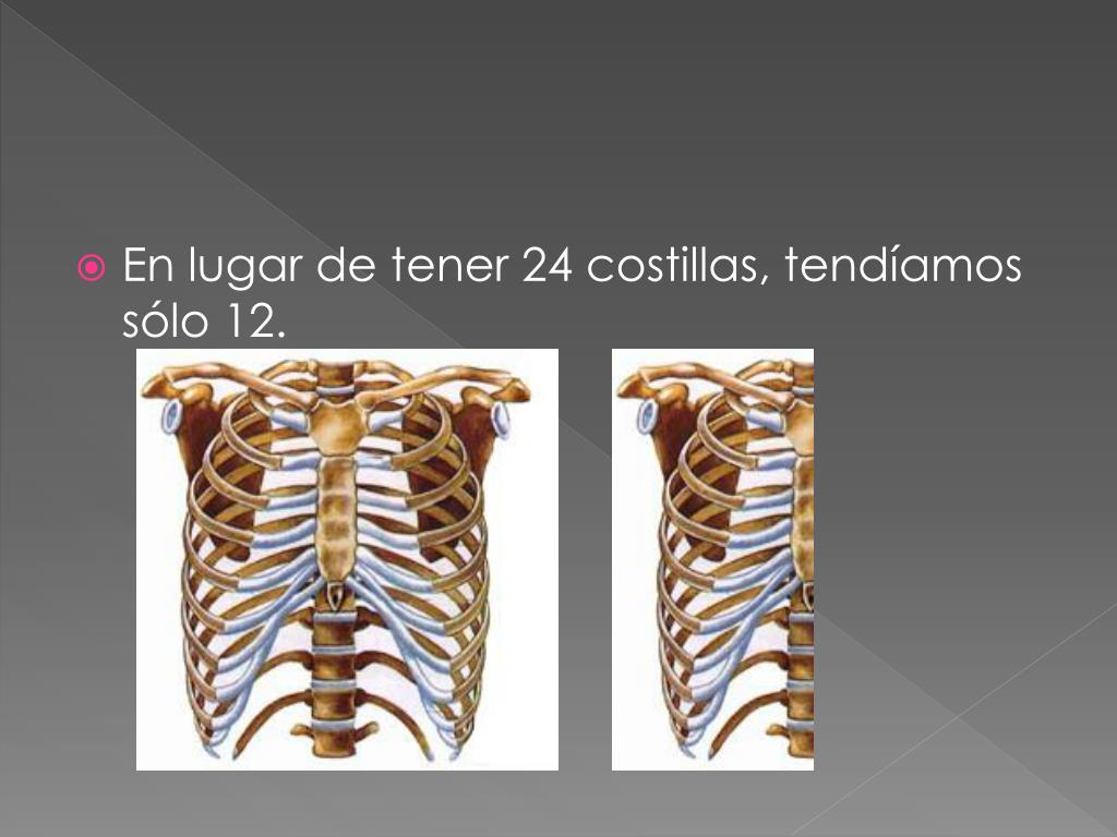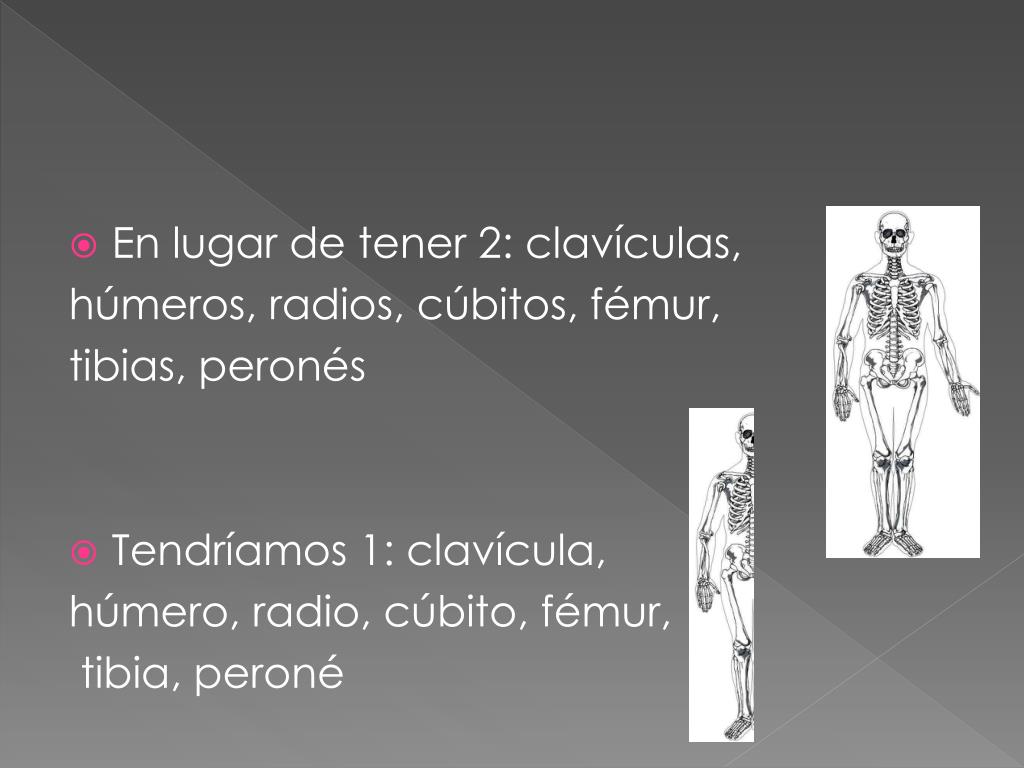 En lugar de tener 2: clavículas, húmeros, radios, cúbitos, fémur, tibias, peronés • Tendríamos 1: clavícula, húmero, radio, cúbito, fémur, tibia, peroné