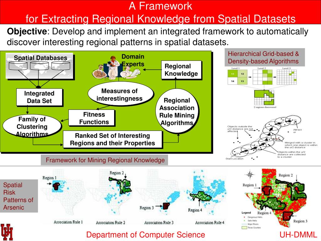 A Framework for Extracting Regional Knowledge from Spatial Datasets DomainExperts Spatial Databases Regional Knowledge Integrated Data Set Regional Association Rule Mining Algorithms Measures of interestingness Fitness Functions Family of Clustering Algorithms Ranked Set of Interesting Regions and their Properties Framework for Mining Regional Knowledge Objective: Develop and implement an integrated framework to automatically discover interesting regional patterns in spatial datasets. Hierarchical Grid-based & Density-based Algorithms Spatial Risk Patterns of Arsenic UH-DMML