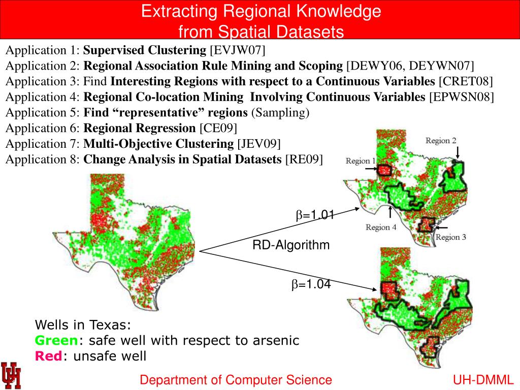 Extracting Regional Knowledge from Spatial Datasets Application 1: Supervised Clustering [EVJW07] Application 2: Regional Association Rule Miningand Scoping [DEWY06, DEYWN07] Application 3: Find Interesting Regions with respect to a Continuous Variables [CRET08] Application 4: Regional Co-location Mining Involving Continuous Variables [EPWSN08] Application 5: Find “representative” regions (Sampling) Application 6: Regional Regression [CE09] Application 7: Multi-Objective Clustering [JEV09] Application 8: Change Analysis in Spatial Datasets [RE09] b=1.01 RD-Algorithm b=1.04 Wells in Texas: Green: safe well with respect to arsenic Red: unsafe well UH-DMML