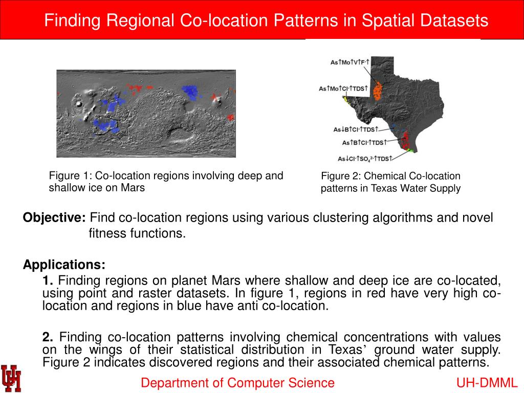 Finding Regional Co-location Patterns in Spatial Datasets Figure 1: Co-location regions involving deep and shallow ice on Mars Figure 2: Chemical Co-location patterns in Texas Water Supply Objective: Find co-location regions using various clustering algorithms and novel fitness functions. Applications: 1. Finding regions on planet Mars where shallow and deep ice are co-located, using point and raster datasets. In figure 1, regions in red have very high co-location and regions in blue have anti co-location. 2. Finding co-location patterns involving chemical concentrations with values on the wings of their statistical distribution in Texas’ ground water supply. Figure 2 indicates discovered regions and their associated chemical patterns. UH-DMML