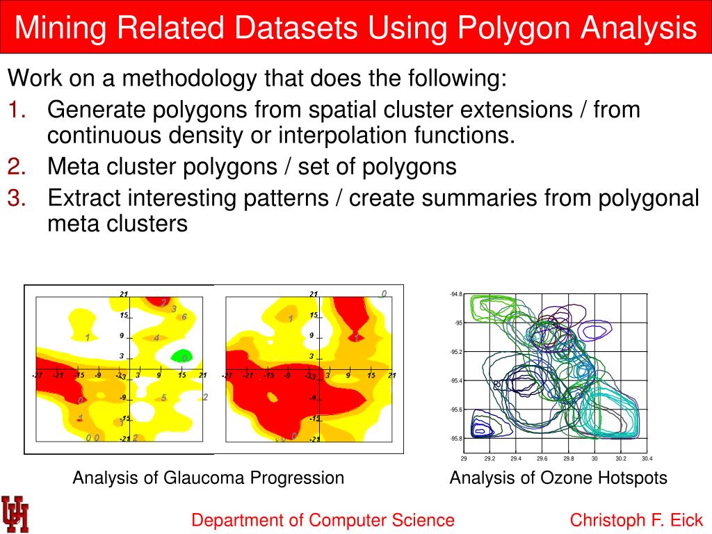 Mining Related Datasets Using Polygon Analysis Work on a methodology that does the following: • Generate polygons from spatial cluster extensions / from continuous density or interpolation functions. • Meta cluster polygons / set of polygons • Extract interesting patterns / create summaries from polygonal meta clusters Analysis of Glaucoma Progression Analysis of Ozone Hotspots Christoph F. Eick