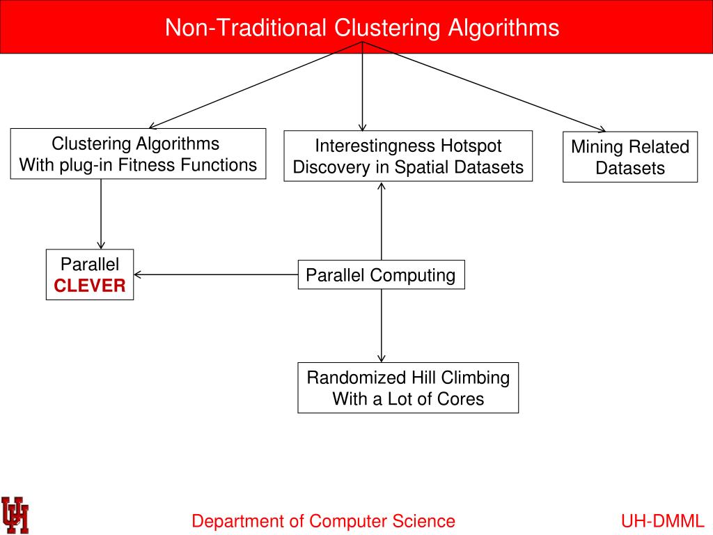Non-Traditional Clustering Algorithms Clustering Algorithms With plug-in Fitness Functions Interestingness Hotspot Discovery in Spatial Datasets Mining Related Datasets Parallel CLEVER Parallel Computing Randomized Hill Climbing With a Lot of Cores UH-DMML