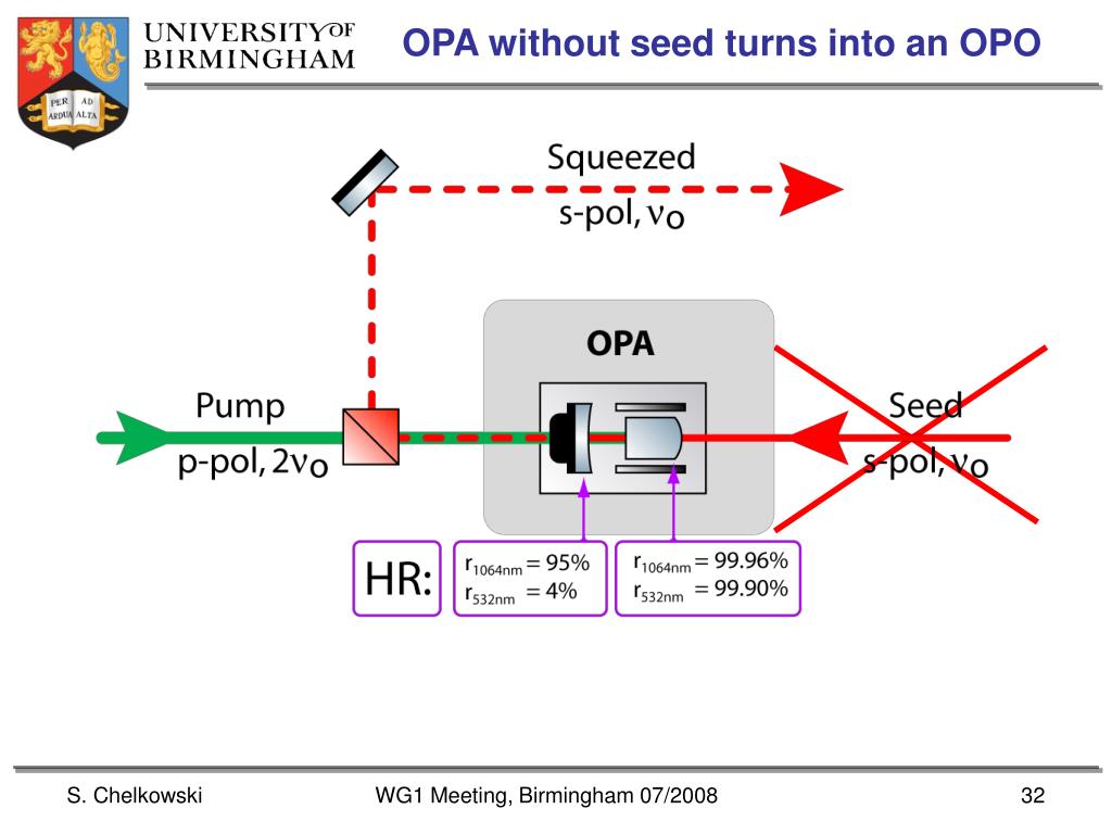 OPA – optical parametric amplification • Seed field carries technical noise from the laser. • Technical noise is imprinted onto the squeezed field. • Seed field is needed for the generation of error signals. WG1 Meeting, Birmingham 07/2008