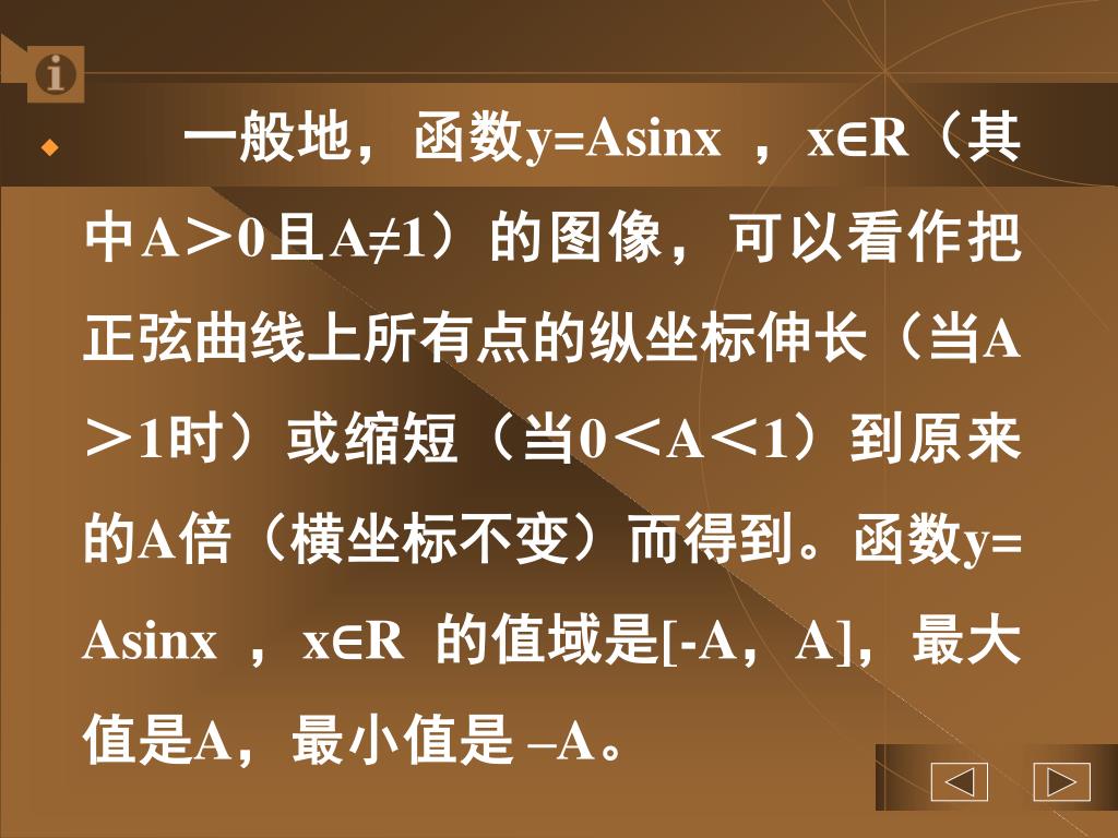 一般地,函数y=Asinx ,x∈R(其中A>0且A≠1)的图像,可以看作把正弦曲线上所有点的纵坐标伸长(当A>1时)或缩短(当0<A<1)到原来的A倍(横坐标不变)而得到。函数y= Asinx ,x∈R 的值域是[-A,A],最大值是A,最小值是 –A。