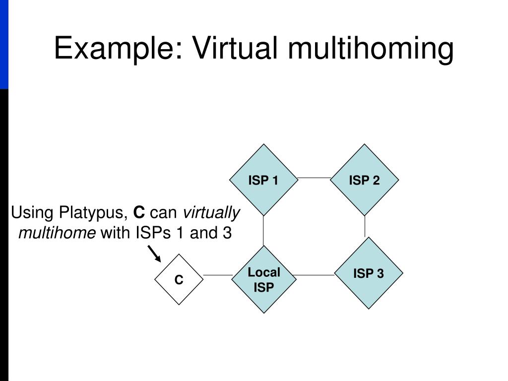 Example: Virtual multihoming ISP 1 ISP 2 Using Platypus, C can virtually multihome with ISPs 1 and 3 ISP 3 Local ISP C