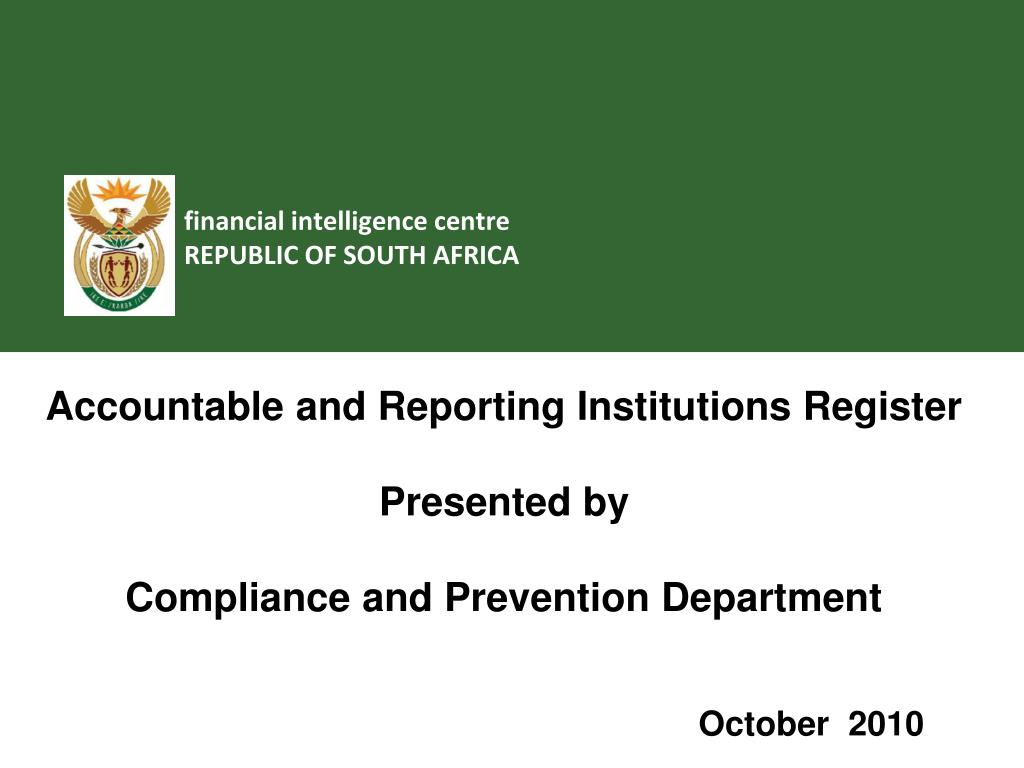 Accountable and Reporting Institutions Register Presented by Compliance and Prevention Department October 2010