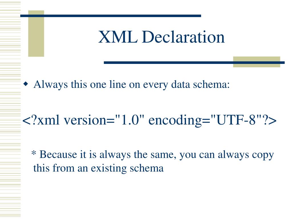 Always this one line on every data schema: <?xml version="1.0" encoding="UTF-8"?> * Because it is always the same, you can always copy this from an existing schema XML Declaration