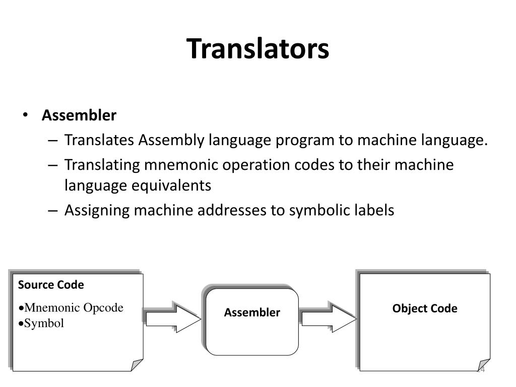 Object Code Source Code • Mnemonic Opcode • Symbol Assembler Translators • Assembler • Translates Assembly language program to machine language. • Translating mnemonic operation codes to their machine language equivalents • Assigning machine addresses to symbolic labels