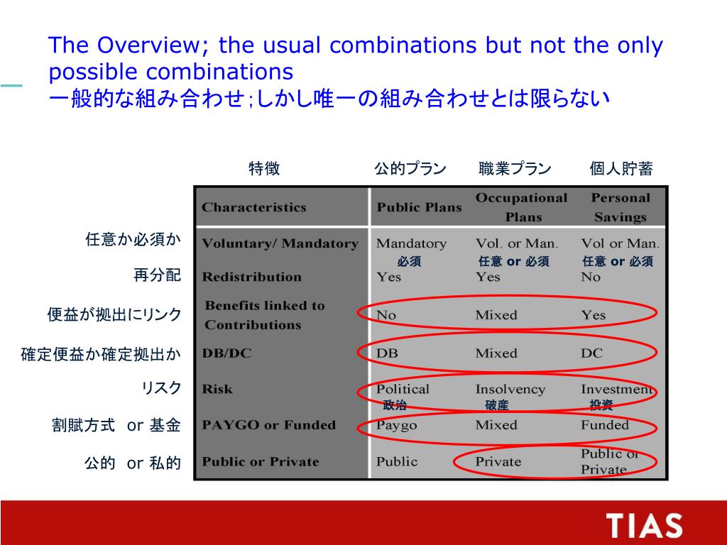 The Overview; the usual combinations but not the only possible combinations一般的な組み合わせ;しかし唯一の組み合わせとは限らない 特徴 公的プラン 職業プラン 個人貯蓄 任意か必須か 必須 任意 or 必須 任意 or 必須 再分配 便益が拠出にリンク 確定便益か確定拠出か リスク 政治 破産 投資 割賦方式 or 基金 公的 or 私的