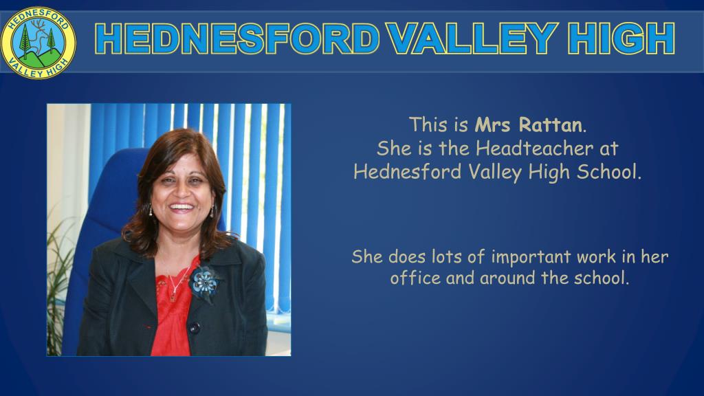 This is Mrs Rattan. She is the Headteacher at Hednesford Valley High School. She does lots of important work in her office and around the school.
