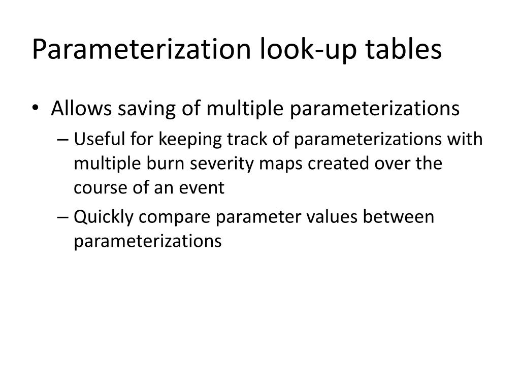 Parameterization look-up tables • Allows saving of multiple parameterizations • Useful for keeping track of parameterizations with multiple burn severity maps created over the course of an event • Quickly compare parameter values between parameterizations