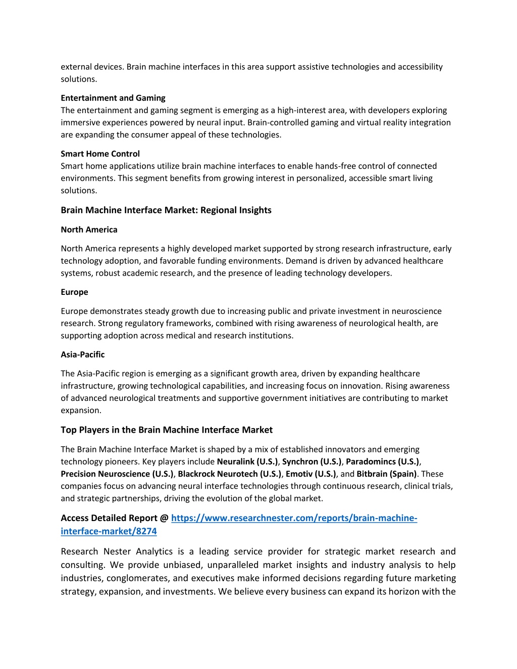 external devices. Brain machine interfaces in this area support assistive technologies and accessibility solutions. Entertainment and Gaming The entertainment and gaming segment is emerging as a high-interest area, with developers exploring immersive experiences powered by neural input. Brain-controlled gaming and virtual reality integration are expanding the consumer appeal of these technologies. Smart Home Control Smart home applications utilize brain machine interfaces to enable hands-free control of connected environments. This segment benefits from growing interest in personalized, accessible smart living solutions. Brain Machine Interface Market: Regional Insights North America North America represents a highly developed market supported by strong research infrastructure, early technology adoption, and favorable funding environments. Demand is driven by advanced healthcare systems, robust academic research, and the presence of leading technology developers. Europe Europe demonstrates steady growth due to increasing public and private investment in neuroscience research. Strong regulatory frameworks, combined with rising awareness of neurological health, are supporting adoption across medical and research institutions. Asia-Pacific The Asia-Pacific region is emerging as a significant growth area, driven by expanding healthcare infrastructure, growing technological capabilities, and increasing focus on innovation. Rising awareness of advanced neurological treatments and supportive government initiatives are contributing to market expansion. Top Players in the Brain Machine Interface Market The Brain Machine Interface Market is shaped by a mix of established innovators and emerging technology pioneers. Key players include Neuralink (U.S.), Synchron (U.S.), Paradomincs (U.S.), Precision Neuroscience (U.S.), Blackrock Neurotech (U.S.), Emotiv (U.S.), and Bitbrain (Spain). These companies focus on advancing neural interface technologies through continuous research, clinical trials, and strategic partnerships, driving the evolution of the global market. Access Detailed Report @ https://www.researchnester.com/reports/brain-machine- interface-market/8274 Research Nester Analytics is a leading service provider for strategic market research and consulting. We provide unbiased, unparalleled market insights and industry analysis to help industries, conglomerates, and executives make informed decisions regarding future marketing strategy, expansion, and investments. We believe every business can expand its horizon with the