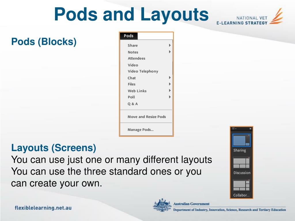 Pods and Layouts Pods (Blocks) Layouts (Screens)You can use just one or many different layouts You can use the three standard ones or you can create your own.