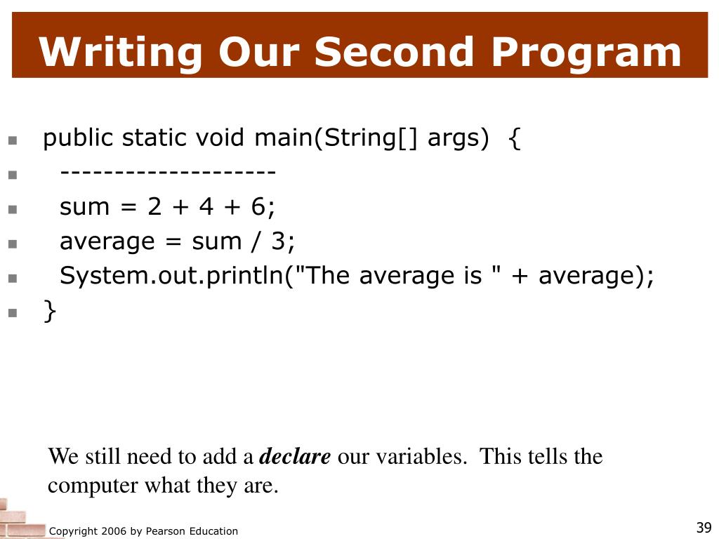 Writing Our Second Program • public static void main(String[] args) { • -------------------- • sum = 2 + 4 + 6; • average = sum / 3; • System.out.println("The average is " + average); • } We still need to add a declare our variables. This tells the computer what they are.